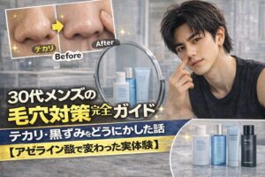 肌の水分を保つセラミドが30代から減り始め、皮脂腺・汗腺の働きも弱くなります。乾燥すると肌が皮脂を過剰に分泌しようとして毛穴が詰まりやすくなる。つまり「テカっているのに実は乾燥している」という状態が30代男性の肌では起きやすいのです。
