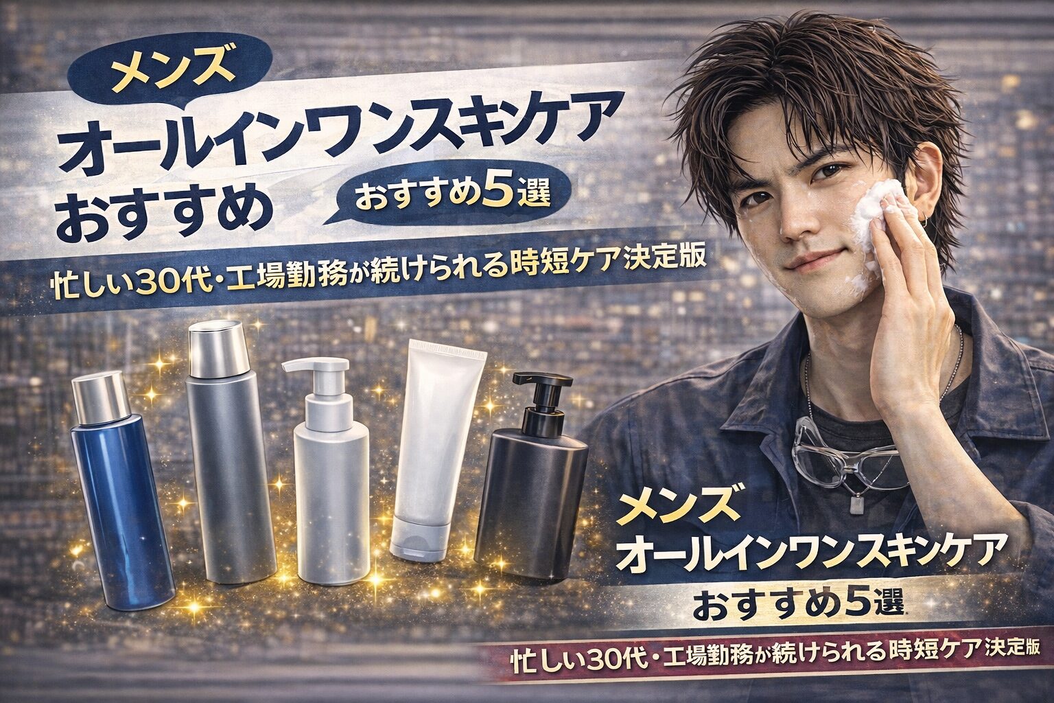 スキンケアを始めたいけど何を揃えればいいかわからない、めんどくさくて続かない——そういう男性に最適な解決策がオールインワンです。化粧水・乳液・美容液が1本にまとまっているため、洗顔後にこれ1本つけるだけでスキンケアが完結します。工場勤務で忙しい俺が続けてきた、30代メンズにおすすめのオールインワン5選を紹介します。